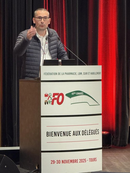 Quelque 120 délégués ont participé au 43è congrès de la fédération FO des métiers de la pharmacie, laboratoires de biologie médicale, cuir et habillement, qui s’est tenu les 29 et 30 novembre 2025 à Tours, sous la présidence du secrétaire général de la confédération, Frédéric Souillot. L’amélioration des salaires et des conditions de travail ainsi que le développement syndical figurent parmi les priorités des militants pour les quatre ans à venir.